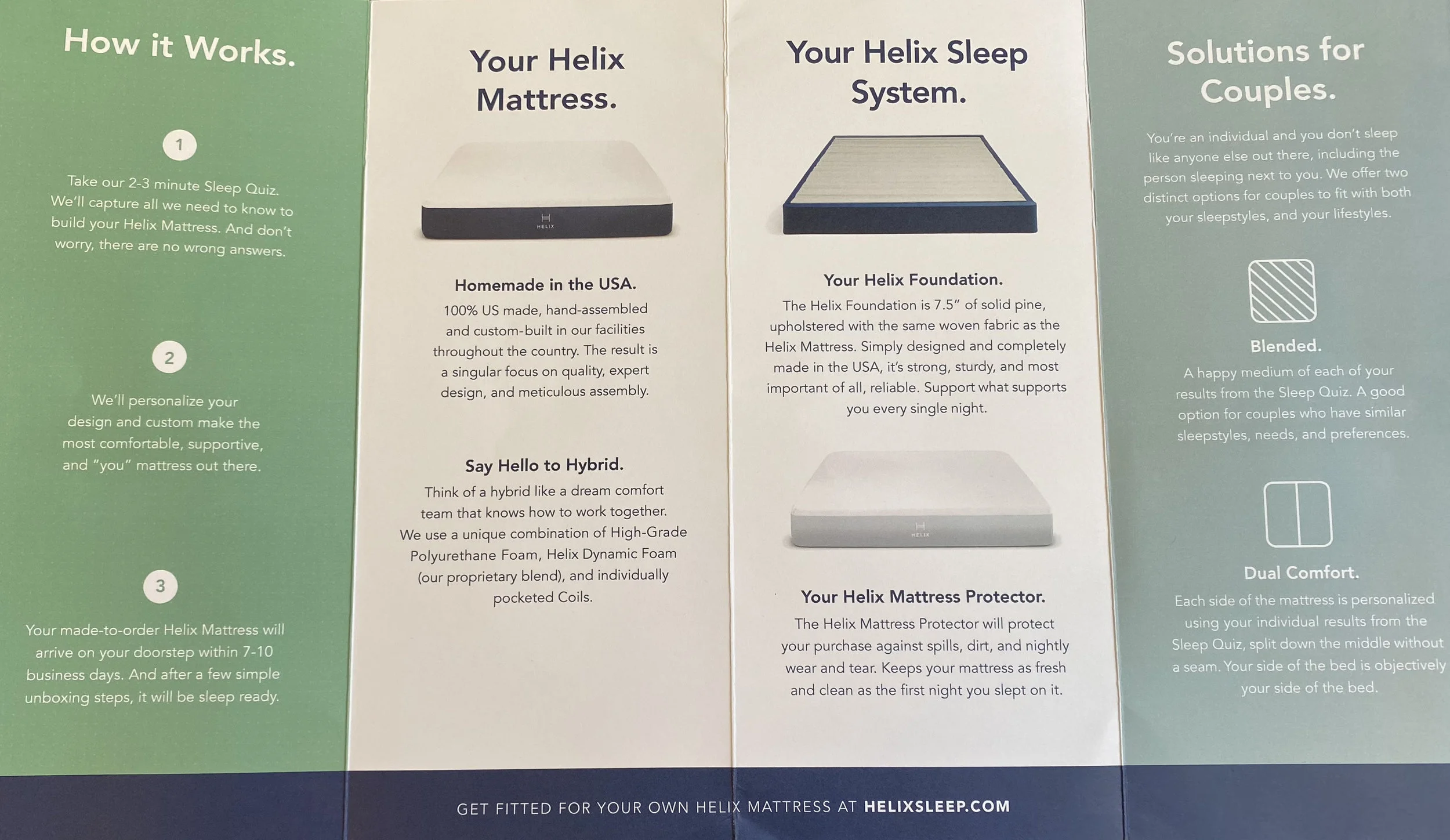 This piece of printed collateral went into every shipment of a Helix Mattress. This updated version was in response to customer confusion, and was designed to engage the customer with a little fun, improved clarity, and new branding.